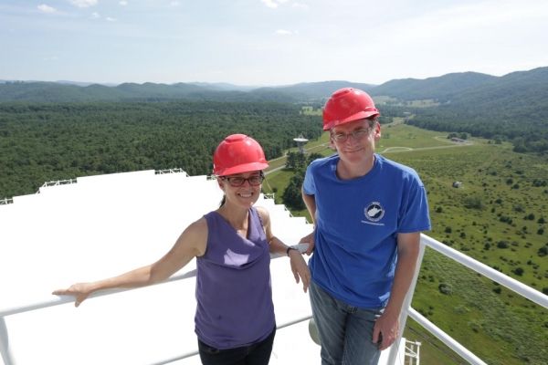 Image: WVU's Maura McLaughlin and Duncan Lorimer use the Green Bank Observatory for research. Here, McLaughlin and Lorimer are standing on top the Green Bank Telescope, which they used to help detect the most massive neutron star ever. (Credit: Scott Lituchy/West Virginia University)