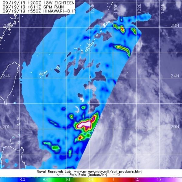 Image: The GPM core satellite passed over strengthening Tropical Storm Tapah in the northwestern Pacific Ocean on Sept. 16 at 12:11 p.m. EDT (1611 UTC) and found the heaviest rainfall (pink) falling at as much as 1.6 inches (40 mm) per hour. Credit: NASA/JAXA/NRL