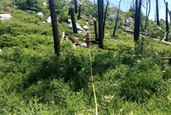 Image: UC Davis’ Clark Richter investigates plant diversity within a transect line of a Sierra Nevada forest affected by drought and wildfire. CREDIT: Clark Richter/UC Davis