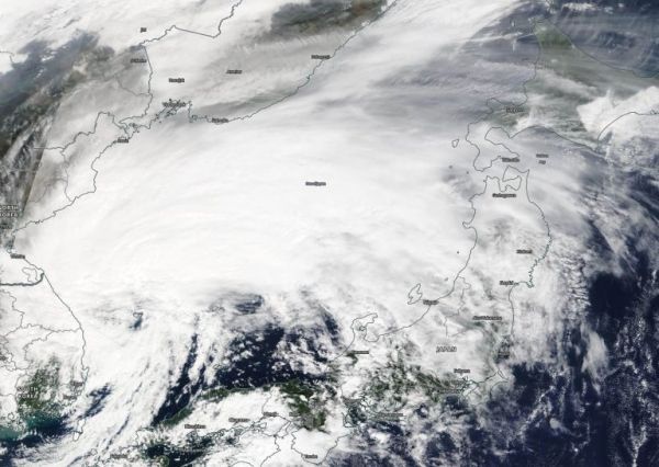 NASA’s Terra satellite passed over the Sea of Japan on Oct. 3 and captured a visible image of Tropical Storm Mitag. Clouds associated with the storm blanketed the Sea of Japan and satellite imagery indicated the storm was becoming extra-tropical.