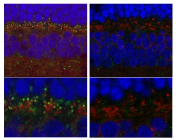 Image: Research led by Penn Vet scientists has revealed the gene underlying a form of night blindess that affects dogs. Dogs with the mutation in theLRIT3 gene (right panels) have less of the resulting protein (labeled yellow-green) in the tips of the retina's ON-bipolar cells than unaffected dogs (left panels). CREDIT: Penn Vet