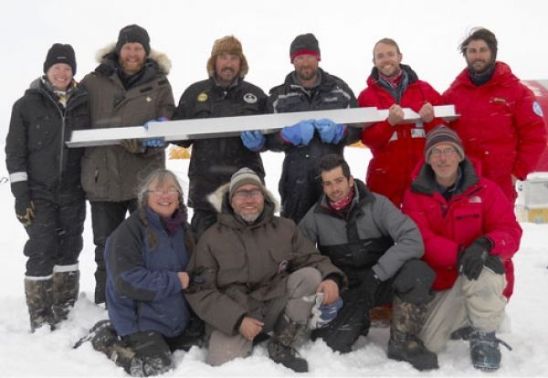 Image: The deepest ice core from the Renland drilling displayed proudly by the international research team that was in the camp when ground was reached. CREDIT: University of Copenhagen
