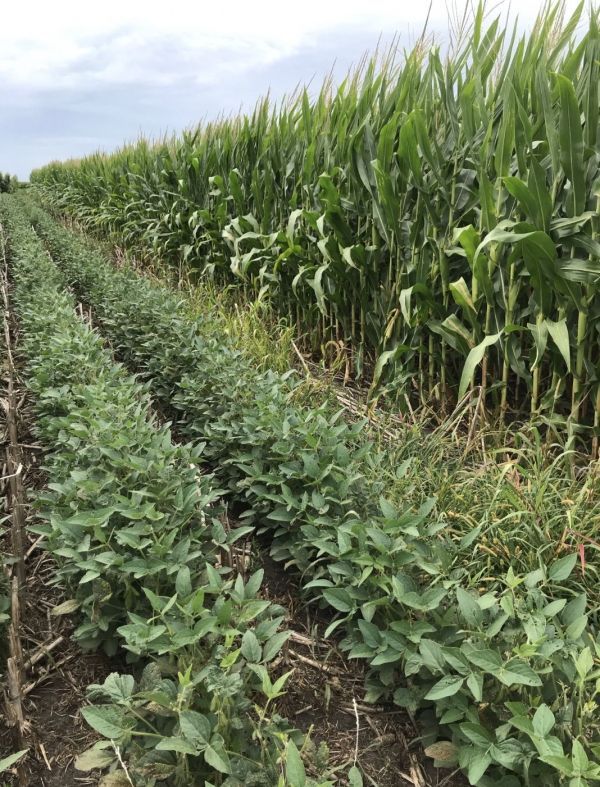 Photo: Corn and soybean grow alongside one another in a field. Corn and soybean crop rotation provides benefits for farmers but also could reduce soil organic matter, according to new research from ISU scientists. Photo courtesy of Steven Hall.