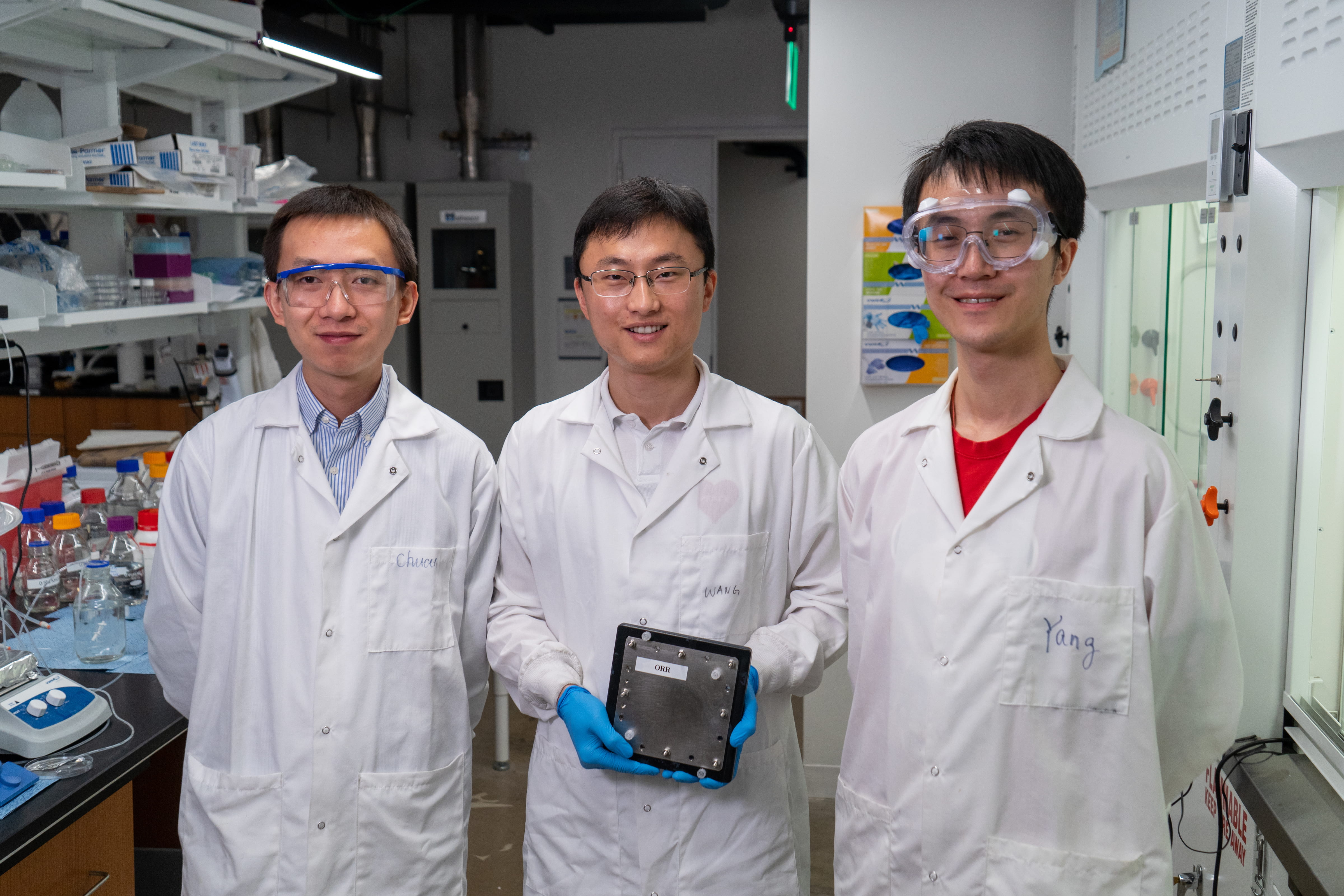 Photo: Rice University researchers – from left, Chuan Xia, Haotian Wang and Yang Xia – show a scaled-up hydrogen peroxide reactor. Photo by Brandon Martin