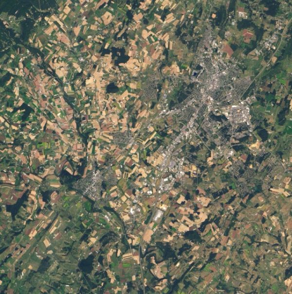 The Operational Land Imager (OLI) on Landsat 8 captured a natural-color image that showcases one of these volcanoes. Privately-owned, tree-covered Mole Hill rises just a few hundred feet above rolling farmland west of Harrisonburg, Virginia.
