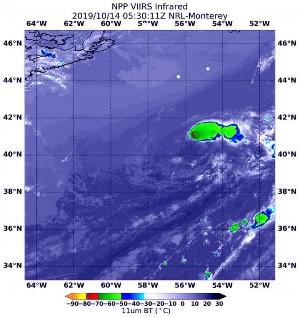 Image: On Oct. 14, 2019 at 1:30 a.m. EDT (0530 UTC), the MODIS instrument that flies aboard NASA-NOAA's Suomi satellite revealed that Melissa was being adversely affected by wind shear that was pushing all storms northeast of the center. In that area, cloud top temperatures were as cold as minus 70 degrees Fahrenheit (minus 56.6 Celsius). (Credit: NASA/NRL)