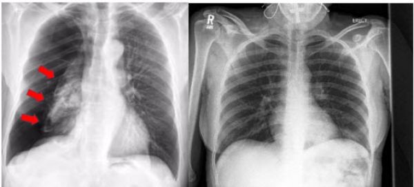 Image: X-ray showing collapsed lung (Left) and X-ray showing a normal lung (Right).