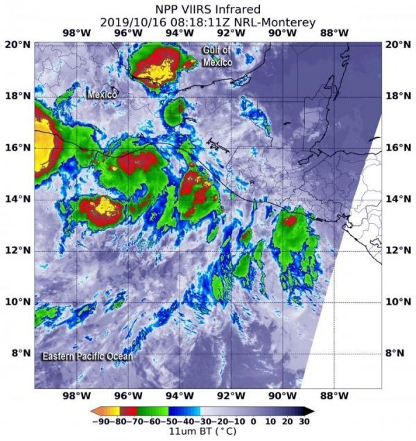 The Visible Infrared Imaging Radiometer Suite (VIIRS) instrument aboard Suomi NPP provided an infrared image of the storm. Infrared imagery reveals cloud top temperatures, and the higher the cloud top, the colder it is, and as such the stronger the storm. On Oct. 16 at 4:18 a.m. EDT (0818 UTC), an infrared VIIRS image showed two small areas around southern Mexico where cloud top temperatures were as cold as minus 80 degrees Fahrenheit (minus 62.2 Celsius). One area, located in the Eastern Pacific Ocean is associated with Potential Tropical Cyclone 17E. Both areas with strongest storms were over water. One in the Eastern Pacific and the other in the western Gulf of Mexico. Storms with cloud tops that cold have been found to generate heavy rainfall.