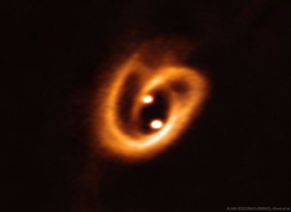 How do binary stars form? To help find out, ESO's Atacama Large Millimeter Array (ALMA) recently captured one of the highest resolution images yet taken of a binary star system in formation. Most stars are not alone -- they typically form as part of a multiple star systems where star each orbits a common center of gravity. The two bright spots in the featured image are small disks that surround the forming proto-stars in [BHB2007] 11, while the surrounding pretzel-shaped filaments are gas and dust that have been gravitationally pulled from a larger disk. The circumstellar filaments span roughly the radius of the orbit of Neptune.