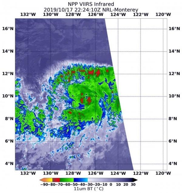 The Visible Infrared Imaging Radiometer Suite (VIIRS) instrument aboard Suomi NPP provided an infrared image of the storm. The National Hurricane Center noted that, “The much improved cloud pattern consists of prominent convective curved bands in the east semicircle and recent bursts of deep convection.” Infrared imagery analyzes cloud top temperatures, and the higher the cloud top, the colder it is, and the stronger the storm. On Oct. 17 at 6:24 p.m. EDT (2224 UTC), a VIIRS image found several areas around the center of circulation where cloud top temperatures were as cold as minus 70 degrees Fahrenheit (minus 56.6 Celsius). Storms with cloud tops that cold have been found to generate heavy rainfall.