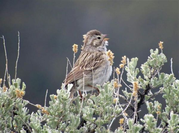 Image: A new study by University of Montana researchers aims to identify less error-prone methods for performing wildlife surveys. As part of the experiment, researchers created call simulations featuring mashups of songs from 10 different bird species, including Brewer's sparrow, pictured here. (Credit: Kaitlyn Strickfaden, University of Montana research associate)