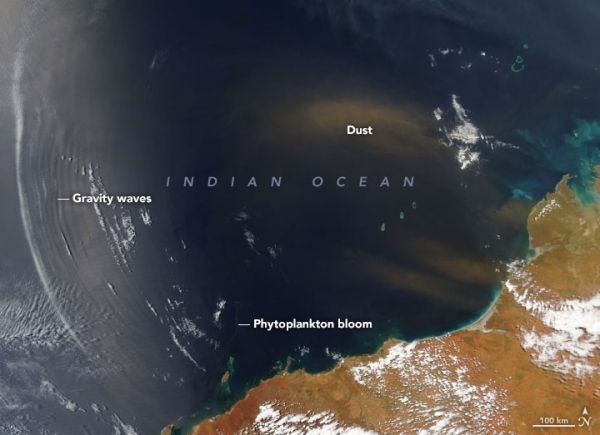 The natural-color image above shows an intricate push-and-pull that recently played out between weather systems, clouds, and dust off the coast of Western Australia. The Moderate Resolution Imaging Spectroradiometer (MODIS) on NASA’s Aqua satellite acquired the image on October 21, 2019.