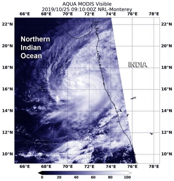 Image: On Oct. 25 at 5:10 a.m. EDT (0910 UTC), the MODIS instrument that flies aboard NASA’s Aqua satellite took this image of Tropical Storm Kyarr off the coast of southwestern India. Credit: NASA/NRL