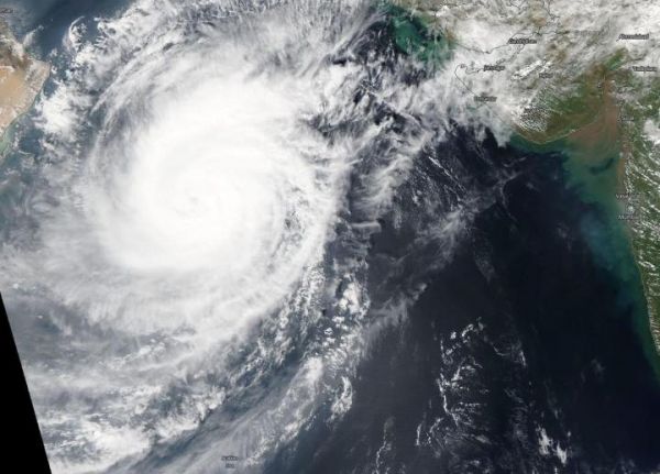 Image: On Oct. 30, the MODIS instrument that flies aboard NASA's Terra satellite took this image of Tropical Cyclone Kyarr in the Arabian Sea. The storm maintained an eye, although clouds filled it in. (Credit: NASA Worldview)
