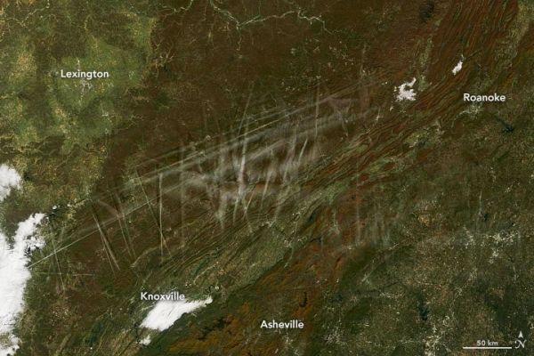 On the morning of October 28, 2019, the Moderate Resolution Imaging Spectroradiometer (MODIS) on NASA’s Terra satellite captured this view of criss-crossing contrails hovering over a stretch of the Appalachian Mountains in Kentucky, Virginia, and West Virginia. Many of the forests were near peak color.
