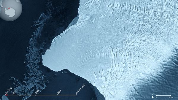 Using radar images from the Copernicus Sentinel-1 mission, the animation shows the evolution of two ice fractures from September 2016 until mid-October 2019. The large chasm running northwards is called Chasm 1, while the split extending eastwards is referred to as the Halloween Crack.
