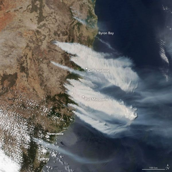The recent spate of fires is visible in this image, acquired at 2:30 p.m. local time on November 8, 2019, by the Visible Infrared Imaging Radiometer Suite (VIIRS) on the NOAA-NASA Suomi NPP satellite. The fires burned near the coast from north of Sydney to the border with Queensland, with thick smoke blowing southeast over the Tasman Sea.
