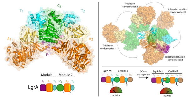 In order to synthesize these drugs, NRPSs operate similar to a factory assembly line, consisting of a series of workstations. Each station, called a “module”, has multi-step workflows and moving parts that allow it to add one building block component to the growing drug.