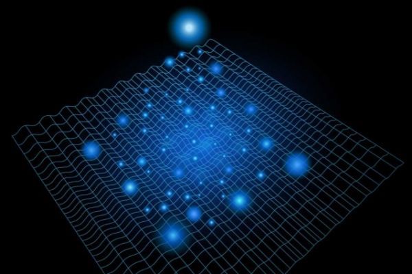 Image: An artist's impression of a light-induced charge density wave (CDW). The wavy mesh represents distortions of the material’s lattice structure caused by the formation of CDWs. Glowing spheres represent photons. In the center, the original CDW is suppressed by a brief pulse of laser light, while a new CDW (at right) appears at right angles to the first. CREDIT: Alfred Zong