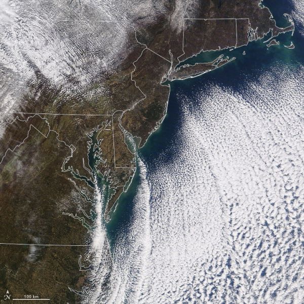 The Moderate Resolution Imaging Spectroradiometer (MODIS) on NASA’s Terra satellite acquired this image on the morning of November 13, 2019. Clouds and snow are visible over parts of Pennsylvania and New York, giving way to clear skies along the coast.