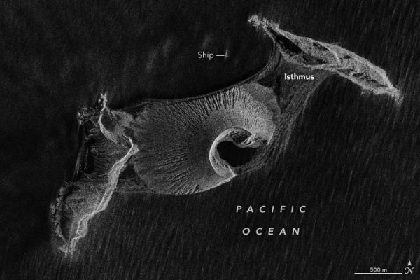 Radar imaging satellites are one way that NASA scientists Jim Garvin and Dan Slayback are studying the island’s evolution at new time scales. Synthetic aperture radar (SAR) provides high-resolution imaging data day or night, when skies are cloudy or clear; that’s particularly important in a cloudy tropical location like the Tonga archipelago. The SAR image above was acquired on October 8, 2019, by the Canadian Space Agency’s RADARSAT-2. (Data are copyright Maxar Technologies Ltd., 2019.)
