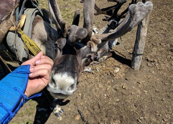 Photo: A domesticated reindeer comes in for a nuzzle. (Credits: William Taylor)