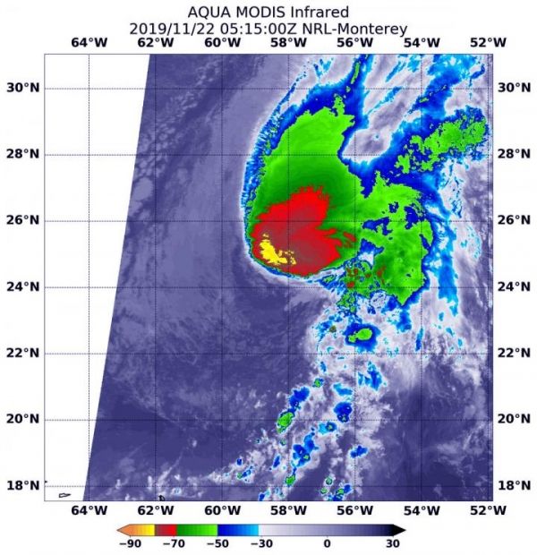 On Nov. 22, 2019 at 1:15 a.m. EST (0515 UTC) the MODIS instrument that flies aboard NASA's Aqua satellite showed on area in Sebastien's southwestern corner where cloud top temperatures were as cold as or colder than (in yellow) minus 80 degrees Fahrenheit (minus 62.2 Celsius). (Photo Credit: NASA/NRL)