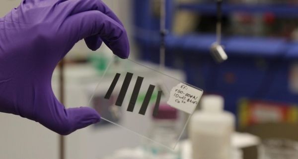 Texas A&M doctoral student Paraskevi Flouda holds sample of new electrode. (Photo credit: Texas A&M Engineering)