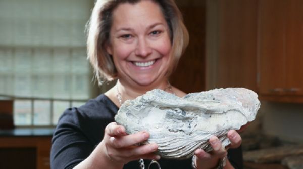 Image: Rowan Lockwood displays one of the 900 oyster fossils studied in a palaeobiological analysis of Chesapeake Bay oysters. Photo by Stephen Salpukas. CREDIT: Virginia Institute of Marine Science