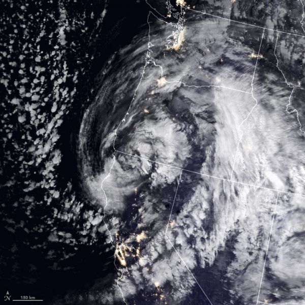 The image above shows the storm as it approached the Oregon coast at 10:15 p.m. Pacific Time on November 26. The image is a composite of brightness temperature data acquired by the Moderate Resolution Imaging Spectroradiometer (MODIS) on NASA’s Terra satellite, overlaid on Black Marble nighttime satellite imagery.