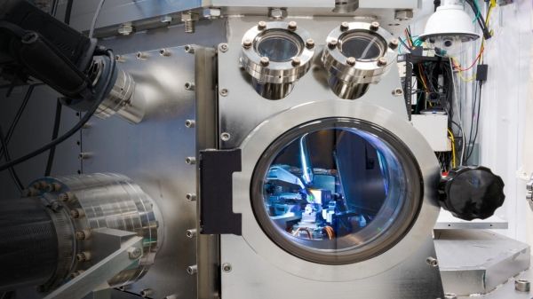 Image: Looking into the hard X-ray nanoprobe synchrotron chamber while measuring a response of an individual cuprous oxide particle to the exposure of carbon dioxide, water and light. (Credit: Tijana Rajh / Argonne National Laboratory)