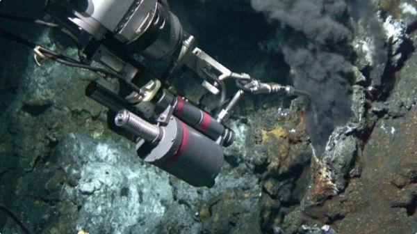 Image: Alvin, the undersea research vehicle, has a robotic arm that deploys a hydraulic fluid sampling device with a "snorkel" that sticks into the black smoker fluid. The operation helps researchers look for old carbon and graphite. (Credit: Photo courtesy of Woods Hole Oceanographic Institution and the Advanced Imaging and Visualization Lab)