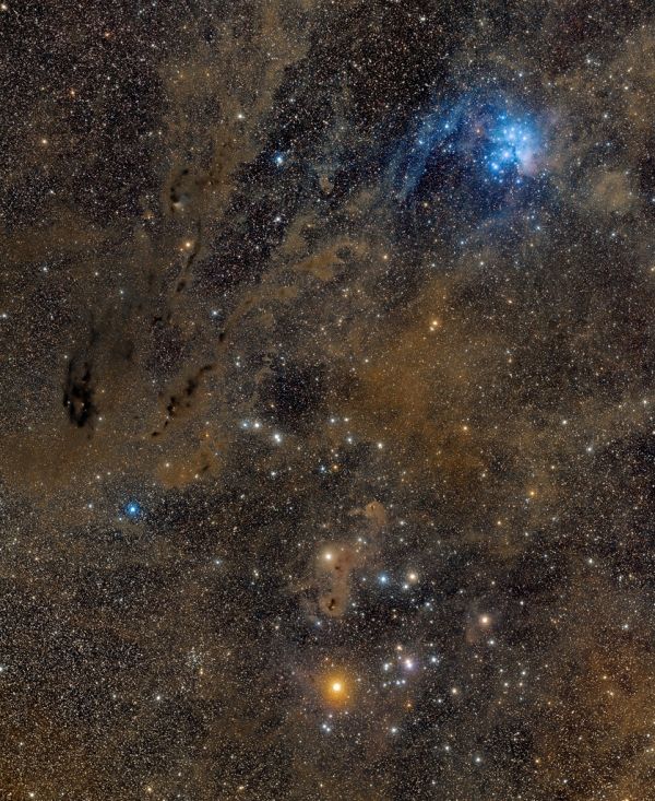 This cosmic vista stretches almost 20 degrees from top to bottom, across the dusty constellation Taurus. It begins at the Pleiades and ends at the Hyades, two star clusters recognized since antiquity in Earth's night sky. At top, the compact Pleiades star cluster is about 400 light-years away. The lovely grouping of young cluster stars shine through dusty clouds that scatter blue starlight. At bottom, the V-shaped Hyades cluster looks more spread out in comparison and lies much closer, 150 light-years away. The Hyades cluster stars seem anchored by bright Aldebaran, a red giant star with a yellowish appearance. But Aldebaran actually lies only 65 light-years distant and just by chance along the line of sight to the Hyades cluster. Faint and darkly obscuring dust clouds found near the edge of the Taurus Molecular Cloud are also evident throughout the celestial scene. The wide field of view includes the dark nebula Barnard 22 at left with youthful star T Tauri and Hind's variable nebula just above Aldebaran in the frame.