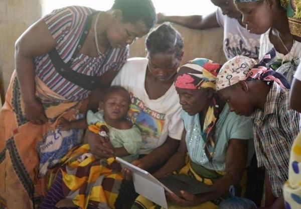 Image: Women in Mozambique watching an animated video on a post-harvest bean storage method. (Credit: Michigan State University)