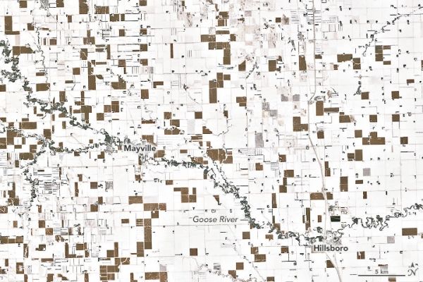 A network of brown squares contrasts starkly with the otherwise snow-white landscape of eastern North Dakota.