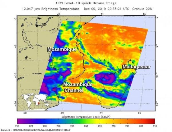 On Dec. 9 at 5:35 p.m. EST (2235 UTC) NASA’s Aqua satellite analyzed the storm using the Atmospheric Infrared Sounder or AIRS instrument. AIRS found coldest cloud top temperatures as cold as or colder than minus 63 degrees Fahrenheit (minus 53 degrees Celsius) around the center and in a band of thunderstorms east of center over northwestern Madagascar. NASA research has shown that cloud top temperatures that cold indicate strong storms that have the capability to create heavy rain.
