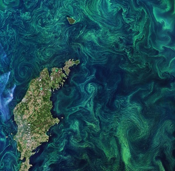 'Algae bloom' is the term used to describe the rapid multiplying of phytoplankton – microscopic marine plants that drift on or near the surface of the sea. The chlorophyll that phytoplankton use for photosynthesis collectively tints the surrounding ocean waters, providing a way of detecting these tiny organisms from space.