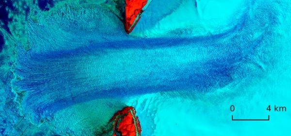 “This is the first documented case of an ice stream being formed. We really didn’t expect to see this,” said lead author Whyjay Zheng, Cornell doctoral student. Now, after about six years of study, the stream resembles a triangular-shaped fan, bordered by dark-shaded crevasses. At the wide center channel, the stream ice flows at a relatively high speed – around 3 miles per year.