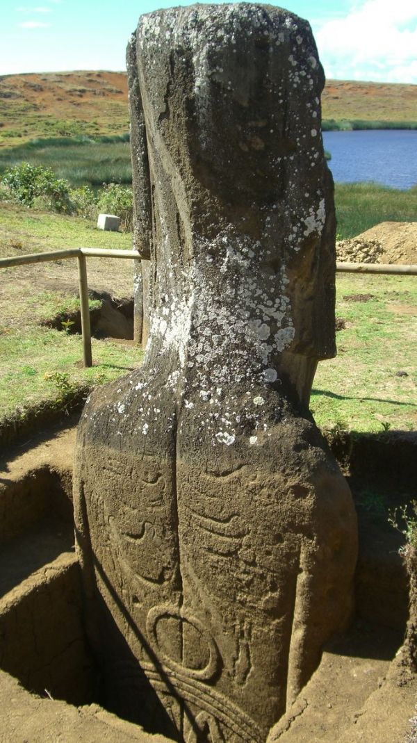 Image: Petroglyphs (rock art) on the back of Moai 157, re-exposed during the excavation of two moai by Jo Anne Van Tilburg and her team at Rano Raraku quarry, Rapa Nui. CREDIT: Easter Island Statue Project