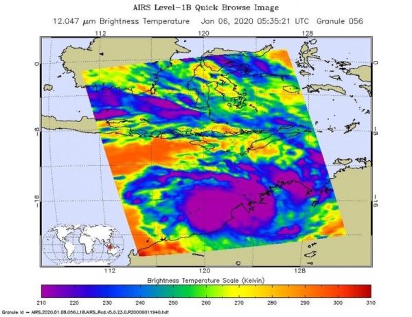 Image: On Jan. 6 at 12:35 a.m. EST (0535 UTC/1:35 p.m. AWST) NASA’s Aqua satellite analyzed Tropical Cyclone Blake’s cloud top temperatures using the AIRS instrument. AIRS showed the strongest storms contained cloud top temperatures as cold as or colder than 210 Kelvin (purple) minus 81 degrees Fahrenheit (minus 63.1 degrees Celsius) around the center. Credit: NASA JPL/Heidar Thrastarson