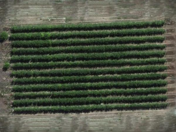 Image: Photo of an apple orchard from above. Walsh's research found that scans from UAVs could collect data to help farmers with water, fertilizer and other decisions. (Credit: Olga Walsh)