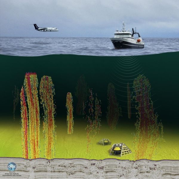 Image: Ocean floor observatories, research ship and airplane were deployed to a area of 250 active methane gas flares in the Arctic Ocean. Credit: Torger Grytå/CAGE