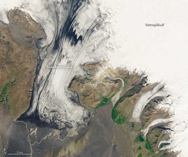 These first two images on this page show the Skeiðarárjökull glacier on July 2, 2019, as observed by the Operational Land Imager on Landsat 8. The black streaks in the close-up image below are volcanic ash layers that became embedded in the glacier after previous eruptions.