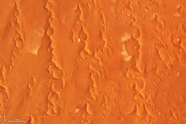 According to Andrew Goudie, a geographer emeritus at University of Oxford, the dunes are “complex linear dunes” (first image), commonly seen across the central part of the Namib Sand Sea. The dunes’ “linear” ridges loom about 100 meters (300 feet) over the desert floor and generally run south to north. They are made “complex” by the myriad other types of dunes that curve and branch from them.