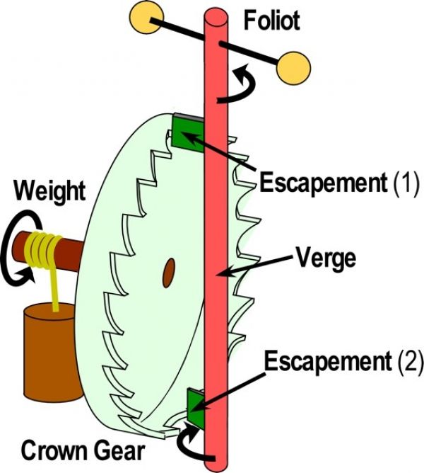 Image: Escapement mechanisms of clocks as a metaphor for protein function like Maxwell’s demons. The Foliot swings back and forth like the pendulum in a clock. The essential features enabling time keeping are labeled. The central function of an escapement is illustrated by the two dark green blades that control the advance of the crown gear in a mechanical clock. CREDIT: University Of North Carolina