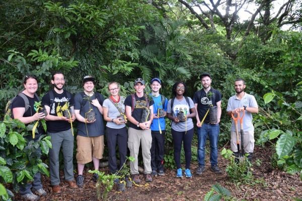 Image: UMBC faculty members Maggie Holland (far left) and Lee Blaney (second from right) are ready to plant trees at a coffee plantation in Costa Rica. This kind of community-engaged work is critical to enhance rural livelihoods, combat climate change, and preserve biodiversity. (Credit: Courtesy Maggie Holland)