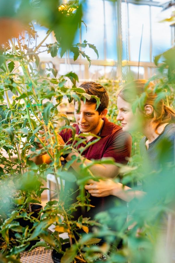Image: Martha Sudermann, right, and Chris Peritore-Galve, graduate students in the lab of plant pathology and plant microbe biology professor Chris Smart, examine tomatoes growing in a greenhouse at Cornell AgriTech in Geneva. CREDIT: Allison Usavage/Cornell University