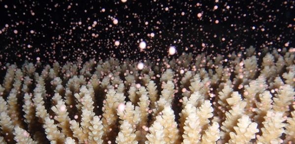 During the early summer, corals simultaneously release tiny balls composed of sperms and eggs, known as bundles, that float to the ocean surface. Here the bundles open, allowing the sperm to fertilize the eggs where they eventually settle on the seafloor and become new coral on the reef.