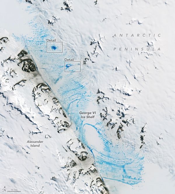 Even in frigid Antarctica, summer warmth can turn ice into water. At the peak of the 2019-2020 melt season, jewel-toned ponds of meltwater spanned a vast area on the George VI ice shelf—a huge slab of floating glacier ice attached to the western side of the Antarctic Peninsula.