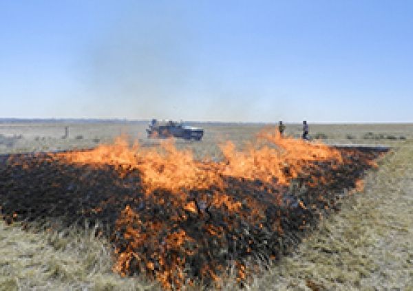 Photo: A USDA-ARS crew burns a small plot using a ring firing technique at Fort Keogh in Miles City Montana. CREDIT: ARS